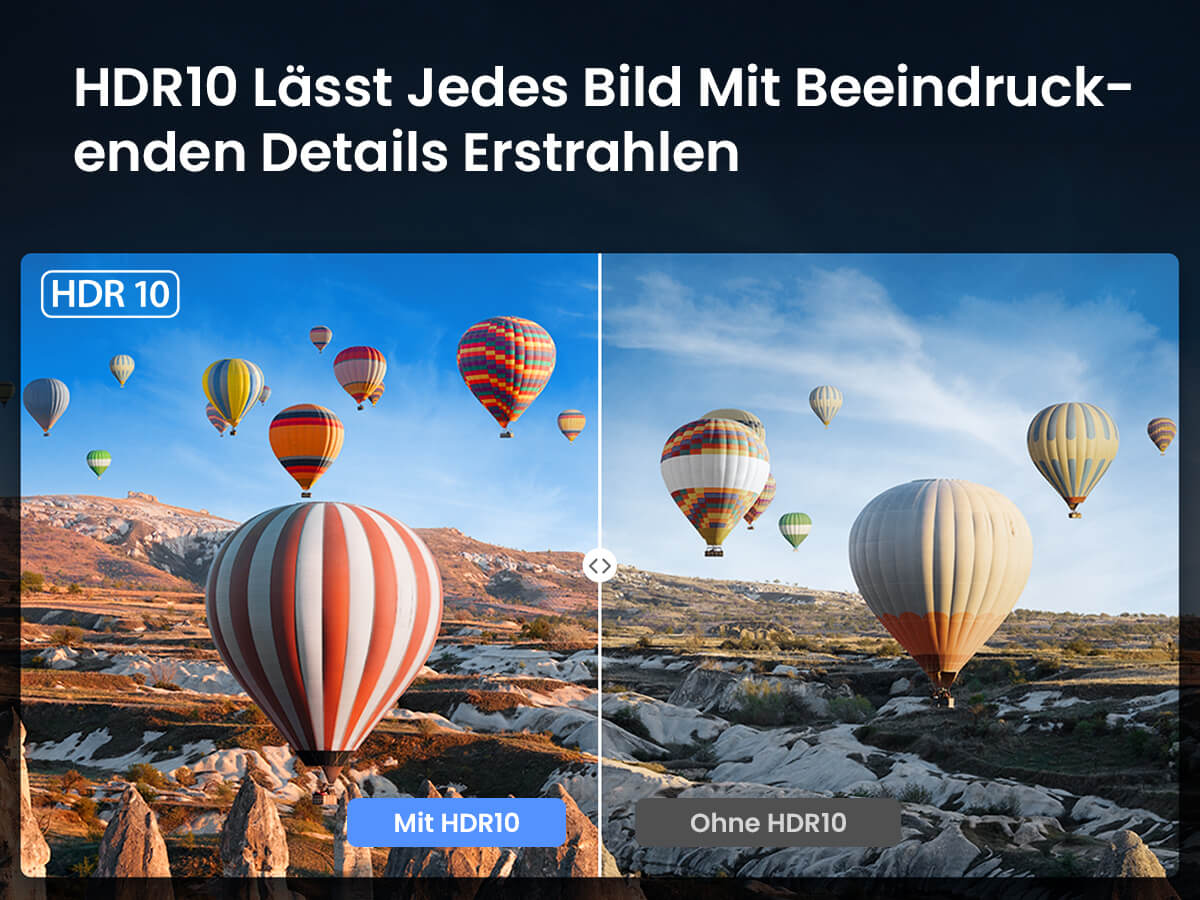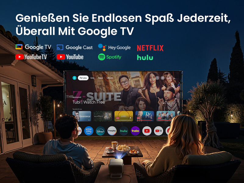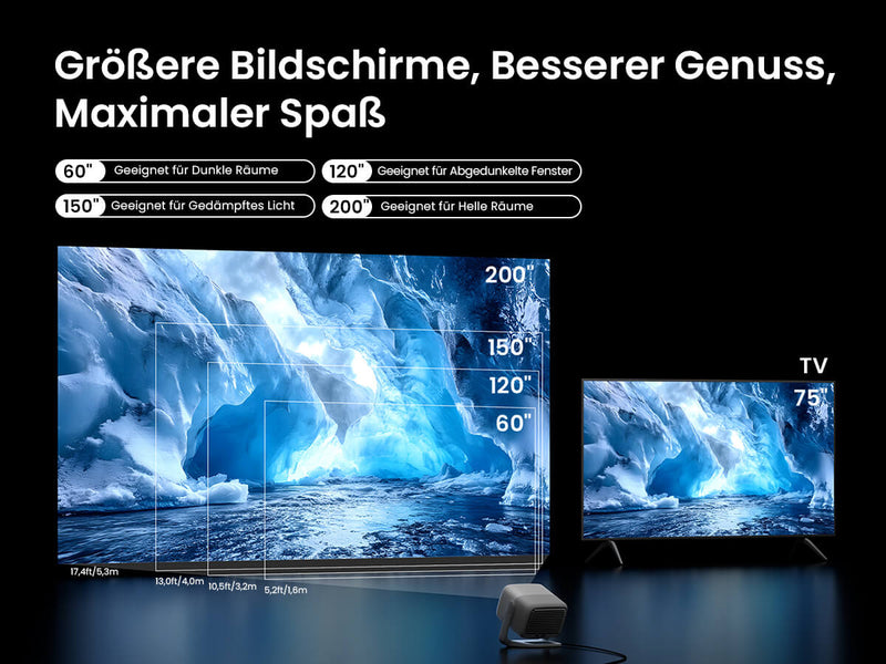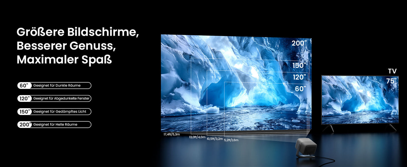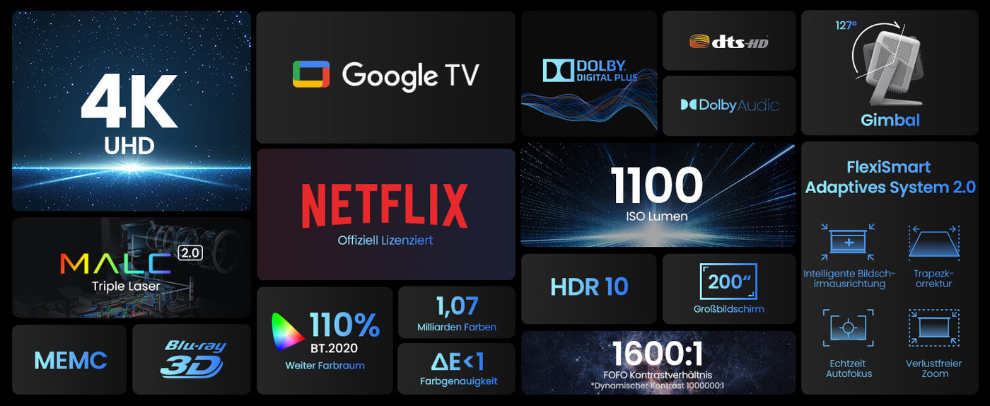 ● Erleben Sie 4K-Kinoqualität: Verwandeln Sie Ihr Zuhause in ein Heimkino mit gestochen scharfer 4K-HDR-Bildqualität, einem riesigen 200-Zoll-Bildschirm, 360°-Dolby-Sound und immersivem 3D.
