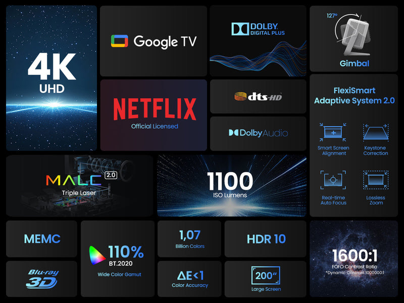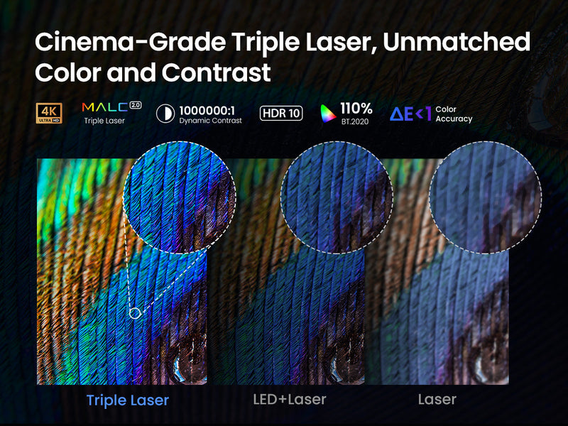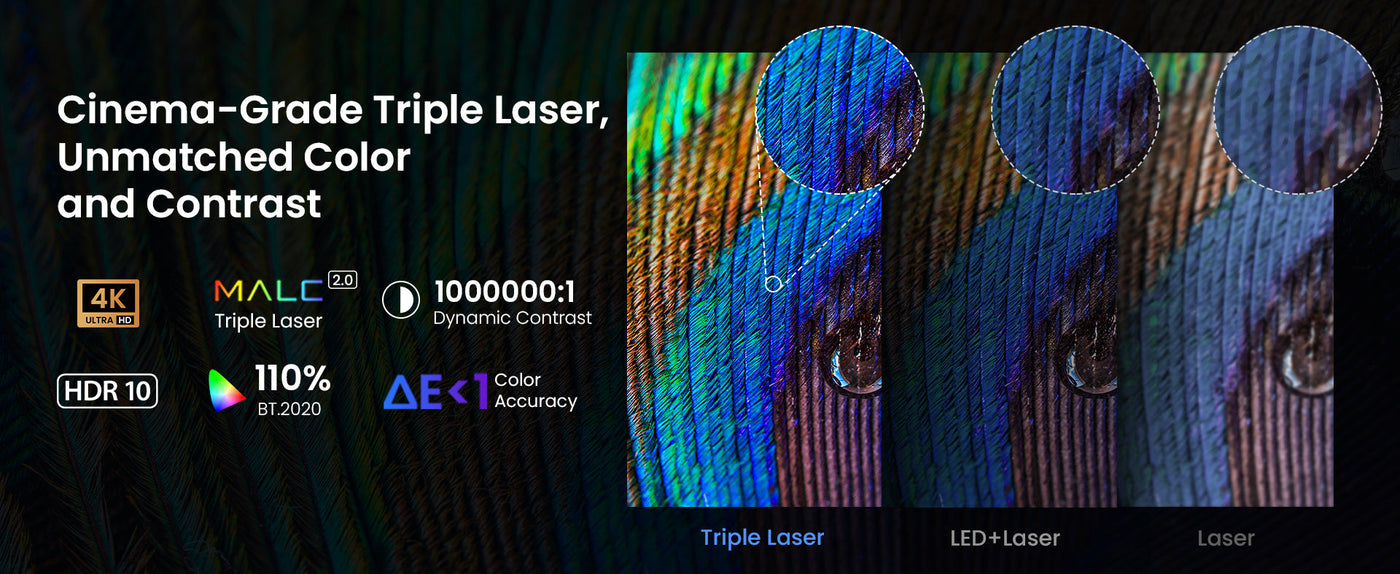 ● Live in Color: Powered by MALC 2.0 triple RGB laser, the N1S 4K delivers ultra-vivid, rainbow-free visuals with 110% BT.2020 color, 1100 ISO lumens, and 1.07 billion colors.
