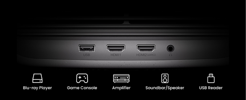 TWO HDMI 2.1 (one supports eARC), One USB-A 2.0, One 3.5mm headphone jack