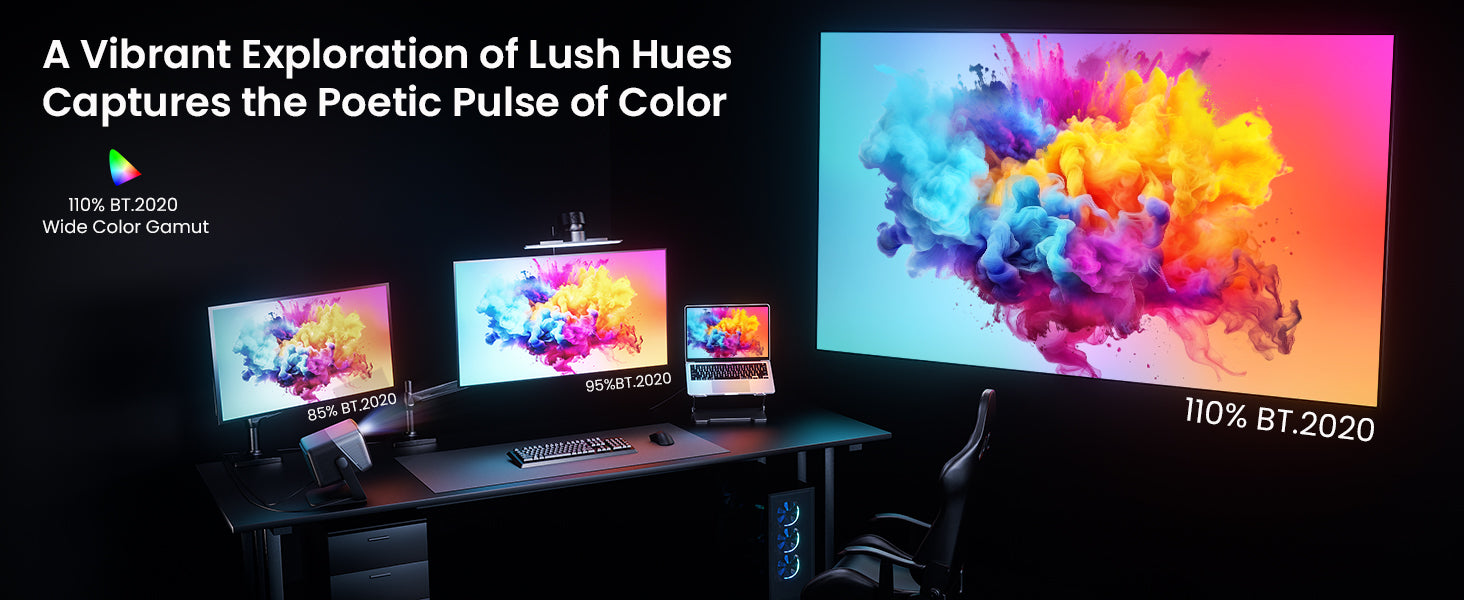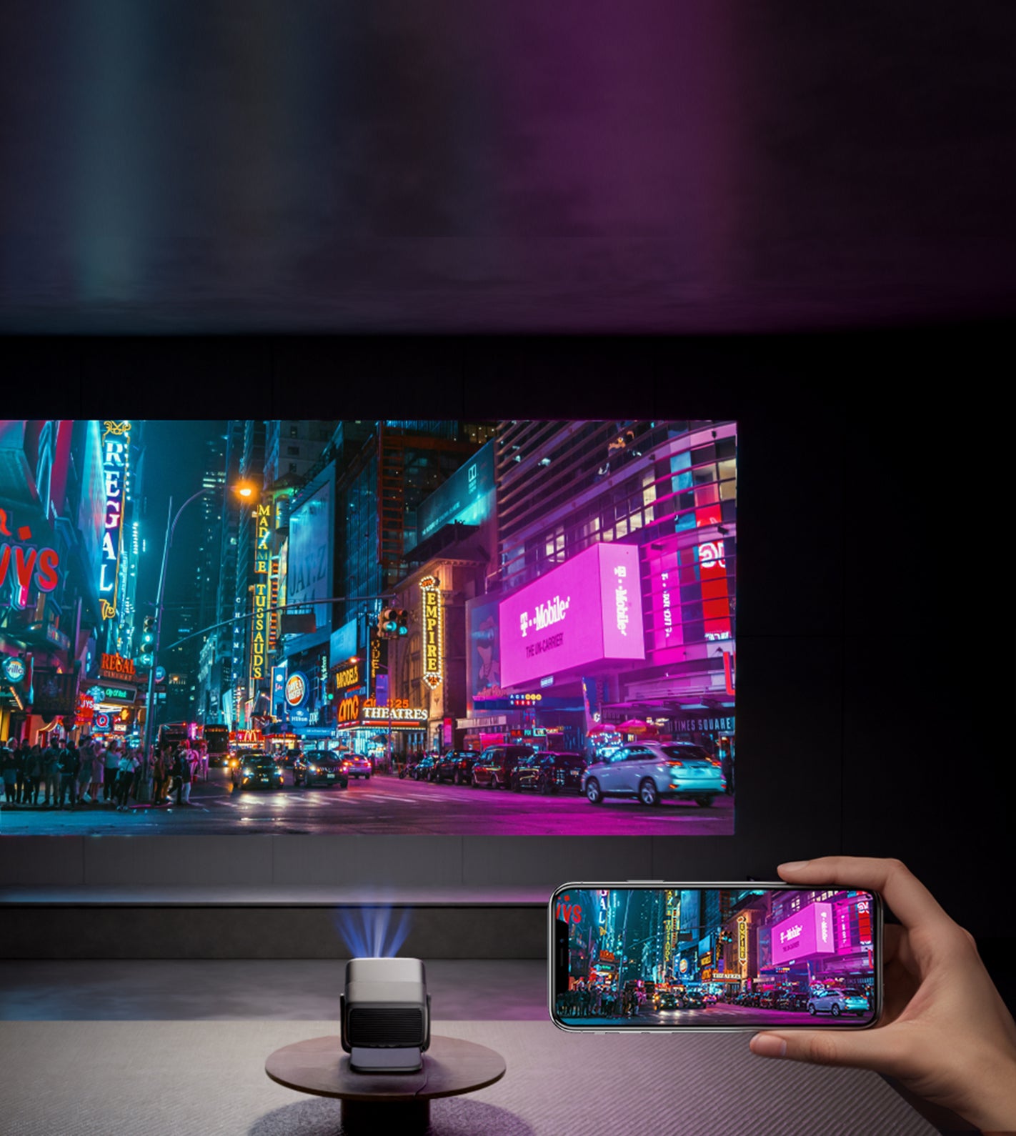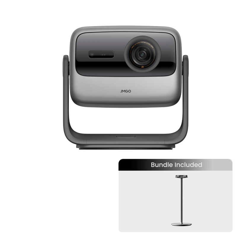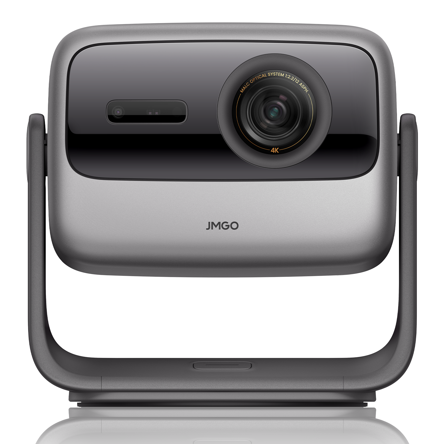The JMGO N1S Ultimate sits on a gimbal stand for placement flexibility, with its Multi Adaptive System adjusting visuals for easy setupJMGO