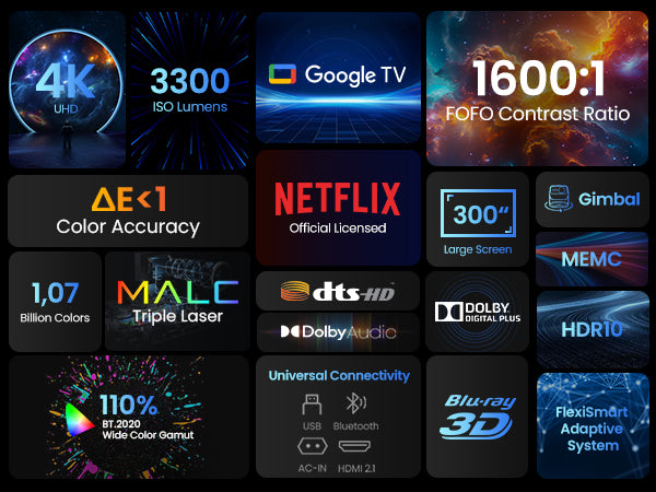 The JMGO N1S Ultimate 4K boosts its usefulness with Google TV and official Netflix. Its 3500-lumens brightness means it can work practically anywhere, while making the most of HDR content, delivering bright, richly coloured scenes.