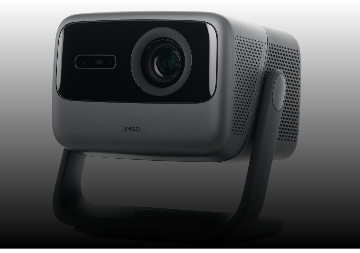 The JMGO N1S Ultimate sits on a gimbal stand for placement flexibility, with its Multi Adaptive System adjusting visuals for easy setupJMGO