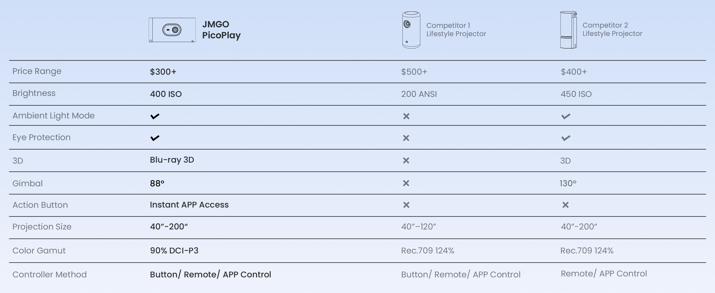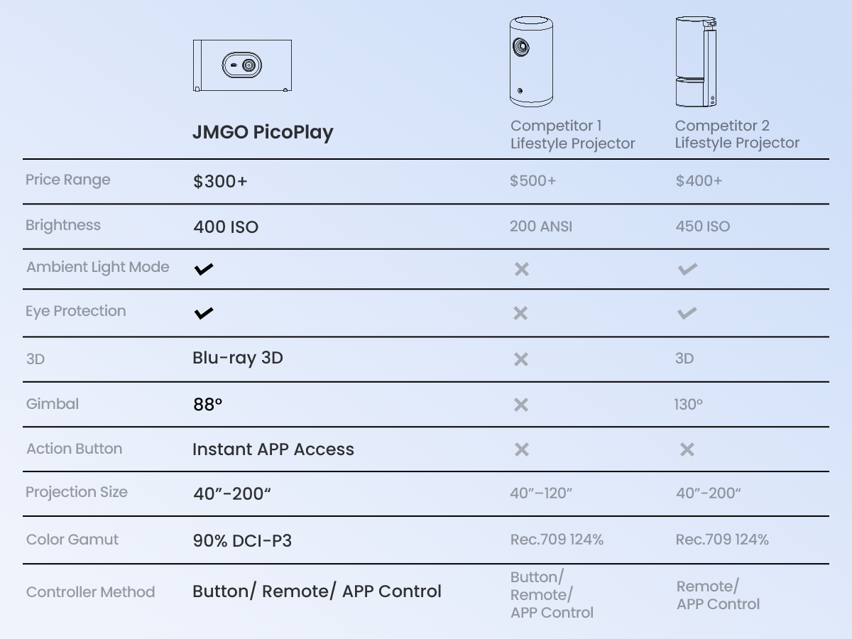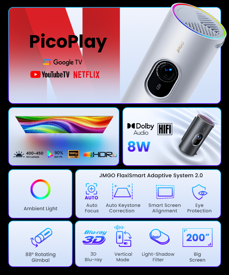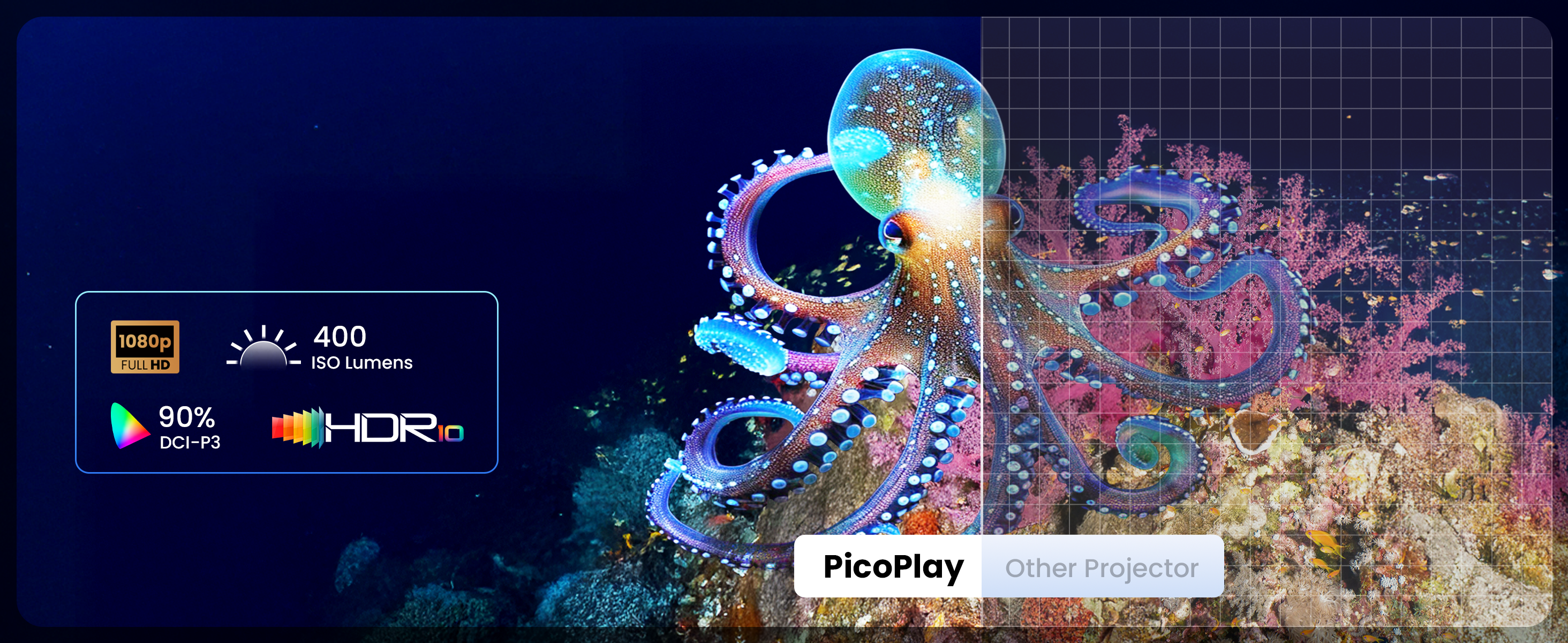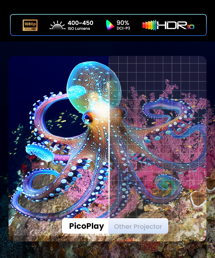 Immersive Visual Feast: Enjoy stunning visuals with 400 ISO Lumens brightness (PicoPlay: 400, PicoPlay+:450), 90% DCI-P3 color, and crisp 1080P resolution—up to a massive 200 inches.