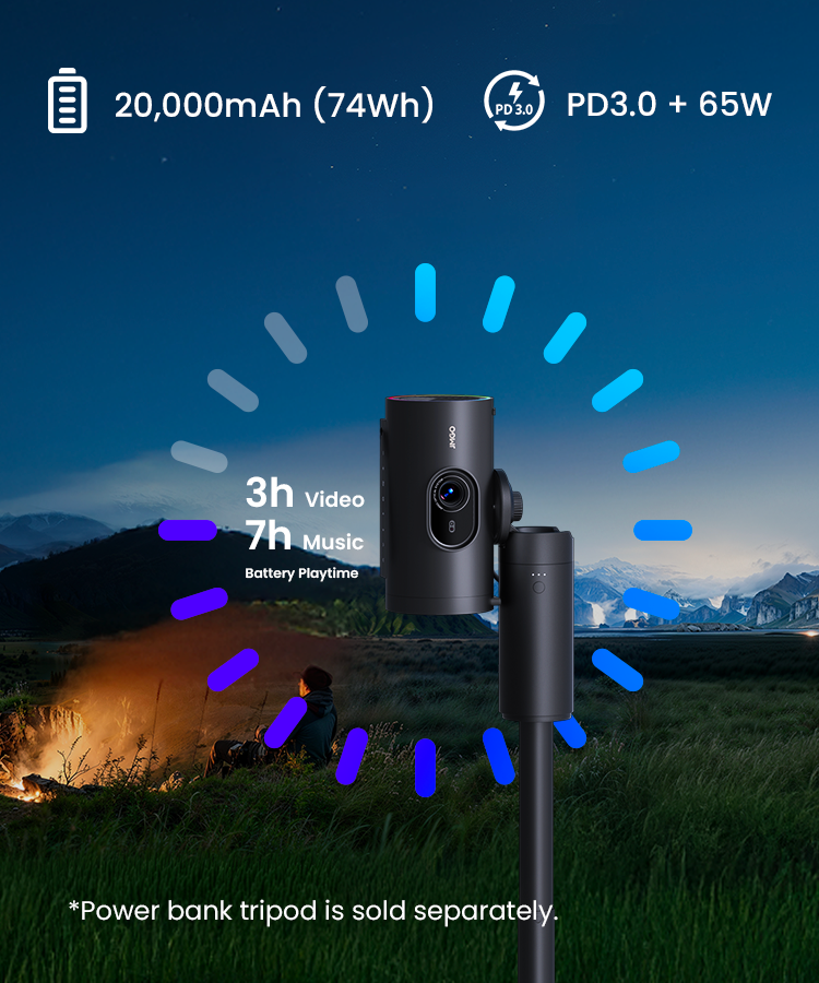 Power Your Adventures: Connect to a 65W Type-C power bank or JMGO battery tripod (sold separately) for up to 3 hours of video or 7 hours of music on the go.