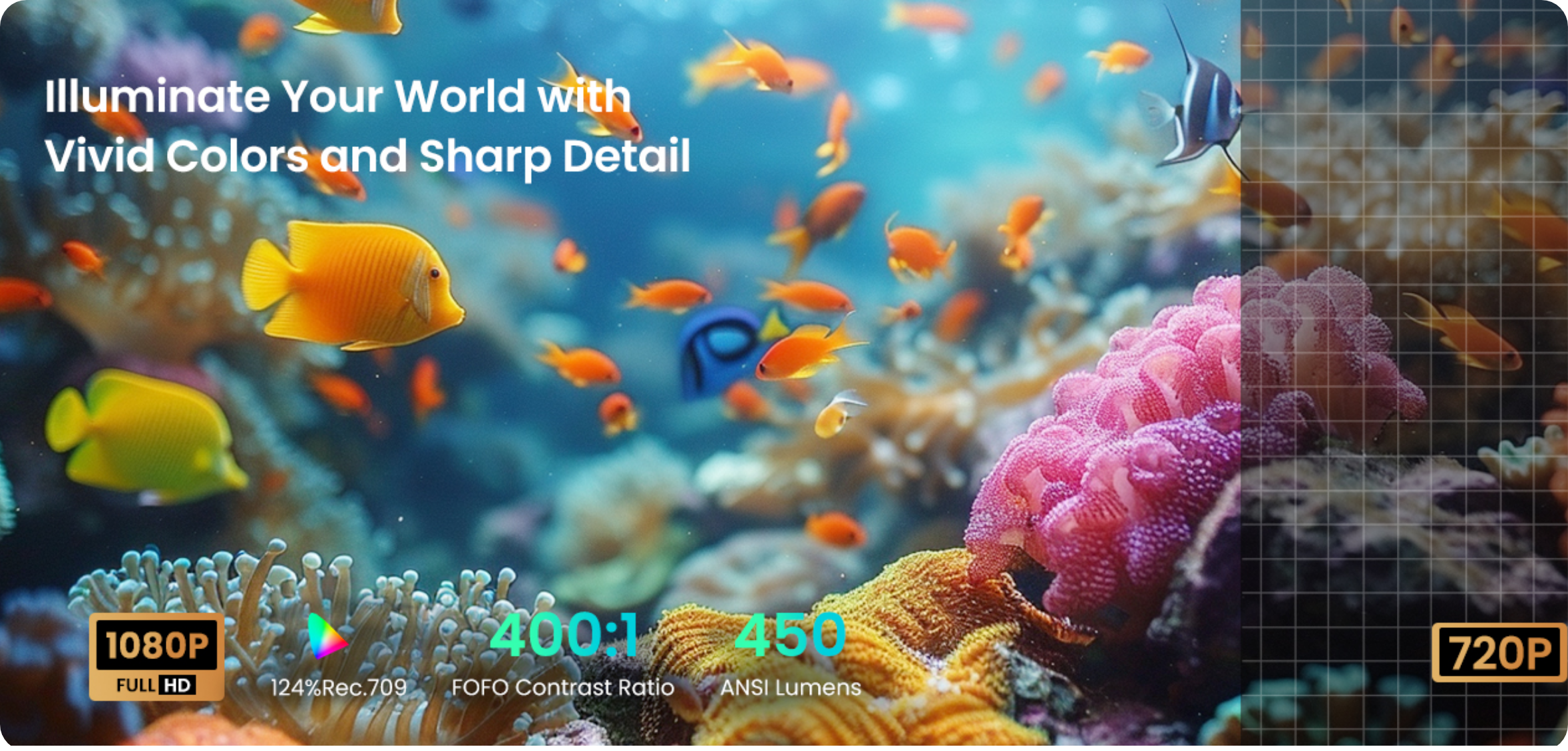 • Stunning Visual Quality: Delivers 420 ISO lumens of brightness, supports HDR10, and features 1080p Full HD resolution for crisp and vivid imagery.